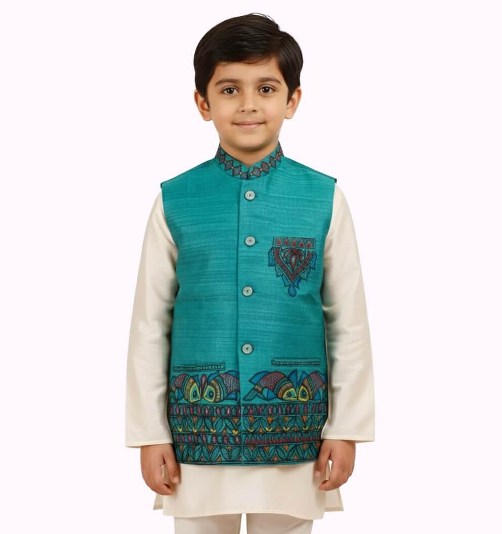 Tussar Silk Nehru Jacket with Mandala Work – Crafted from premium tussar silk, this elegant jacket features intricate mandala-inspired handcrafted detailing, offering a refined ethnic look for festive occasions.