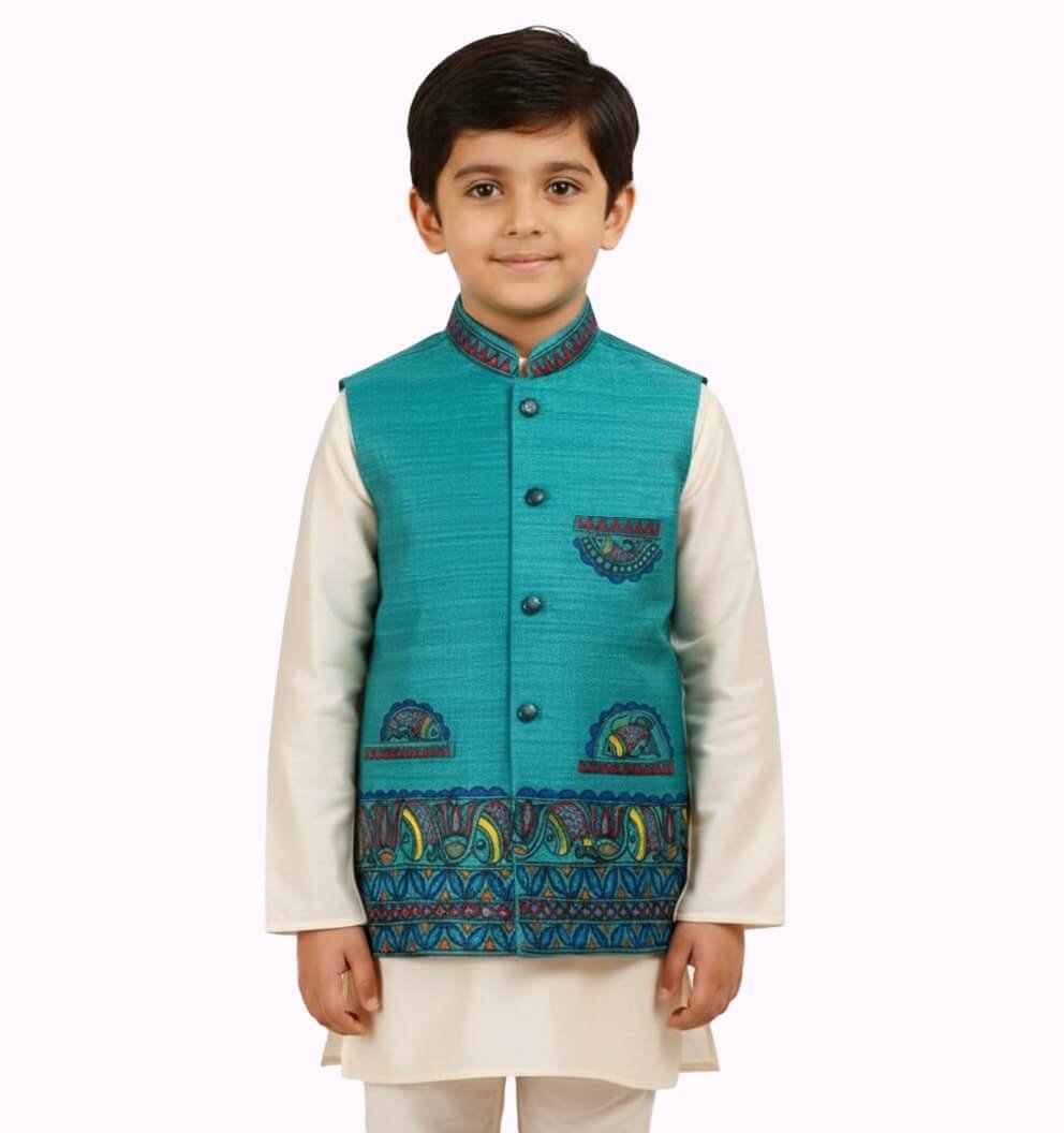 Tussar Silk Nehru Jacket with Mandala Work – Crafted from premium tussar silk, this elegant jacket features intricate mandala-inspired handcrafted detailing, offering a refined ethnic look for festive occasions.