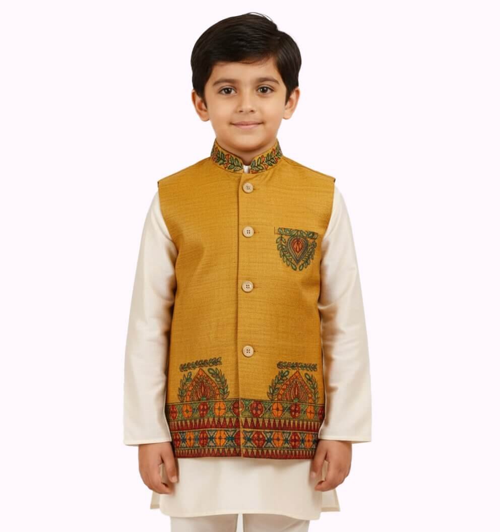 Tussar Silk Nehru Jacket – Crafted from rich tussar silk with intricate handcrafted detailing, this elegant jacket blends traditional artistry with a refined, contemporary look.