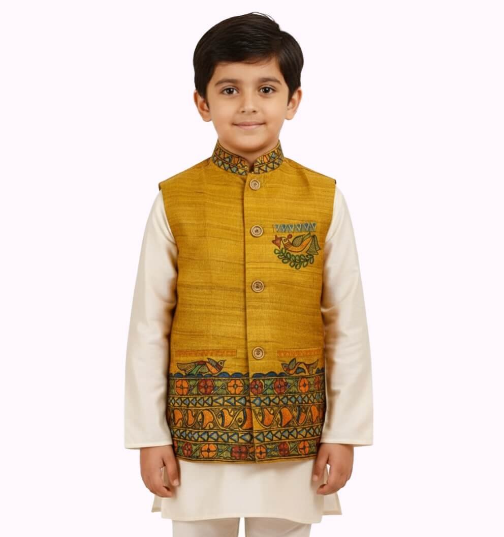 Tussar Silk Nehru Jacket – Crafted from rich tussar silk with intricate handcrafted detailing, this elegant jacket blends traditional artistry with a refined, contemporary look.