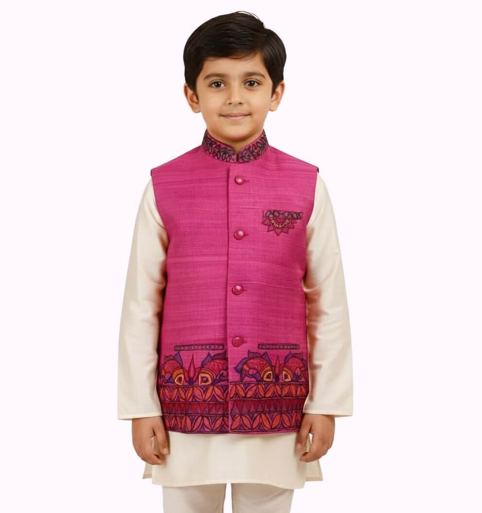 Tussar Silk Nehru Jacket with Madhubani Painting – Crafted from fine tussar silk, this jacket showcases intricate Madhubani-inspired artwork, blending traditional Indian art with timeless elegance.