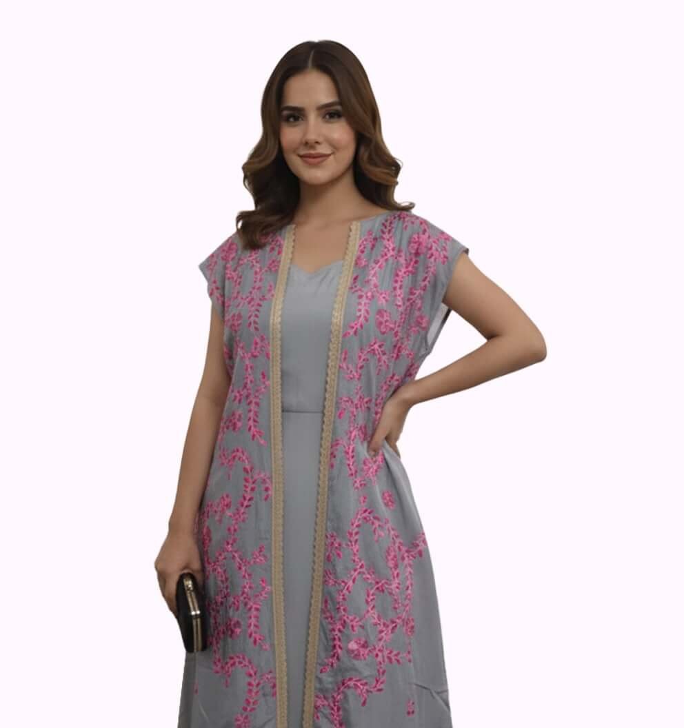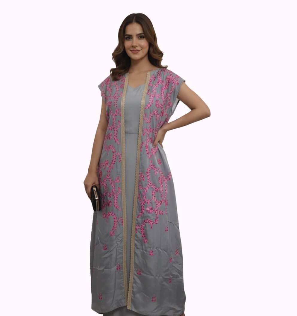 This stylish women’s shrug is crafted in pure chinnon and beautifully detailed with traditional Phulkari hand embroidery, adding a graceful ethnic touch to any outfit.